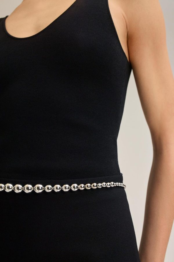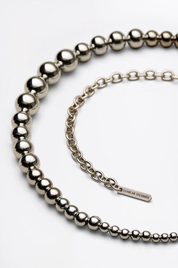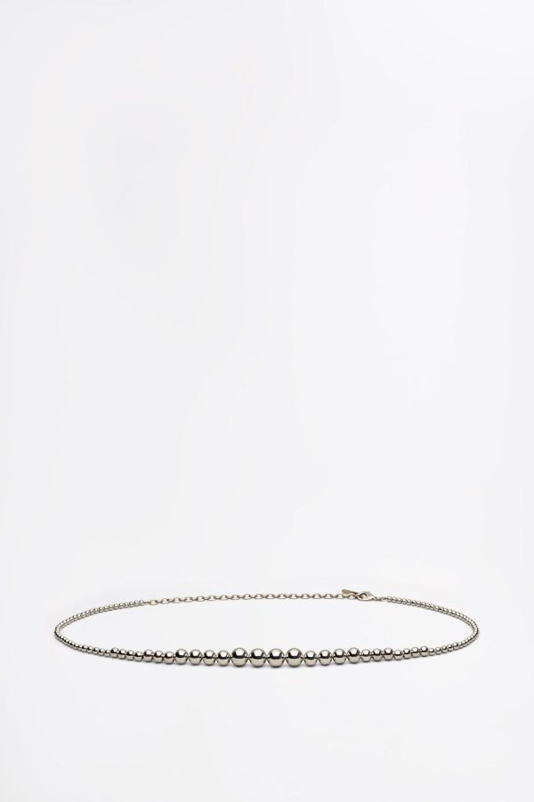 Crafted with a refined, minimalist design, the belt is accented by silver spheres that vary in size and an adjustable chain clasp.