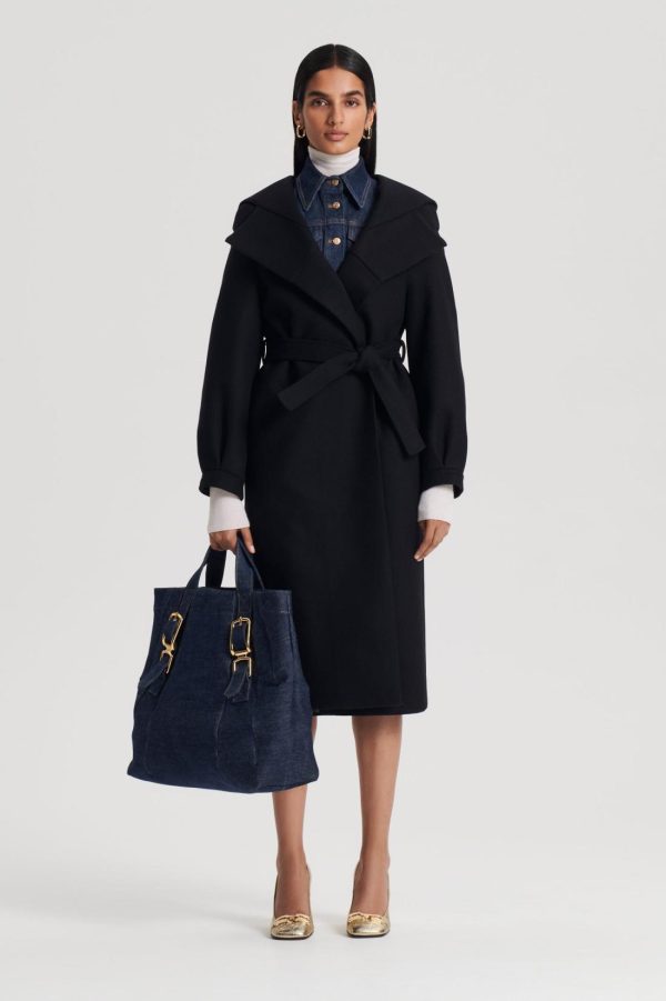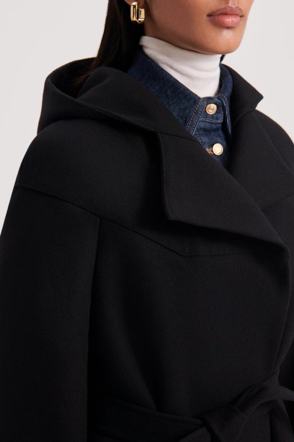 The Hooded Duffle fuses timeless design codes with refined detailing. Crafted from a soft wool blend, the relaxed silhouette features a high, wrap neck that can be styled as a wide v-neckline and open collar. Tailored to fall below the knee, the belted waist adds dimension to the enveloping silhouette. Pair over denim ensembles for a refined daily ensemble.