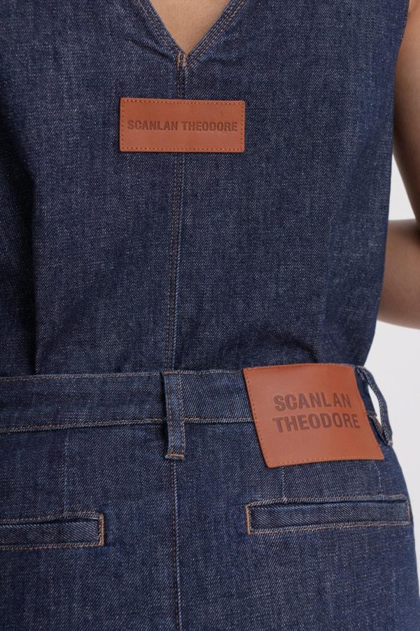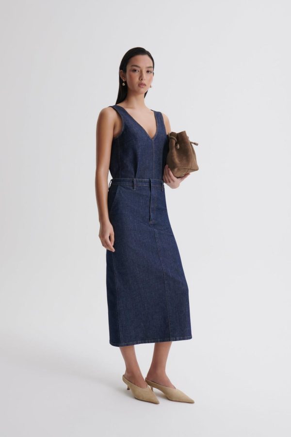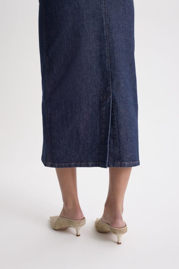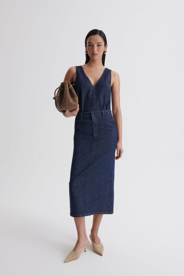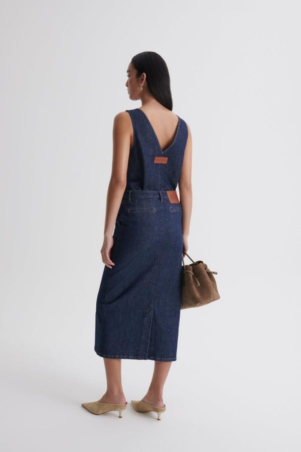 Unveiling the timeless elegance of Italian denim, this mid-length skirt is crafted from cotton in a dark indigo wash. The contrast topstitching, belt loops and signature embossed leather patch elevate the minimalist, pencil silhouette.