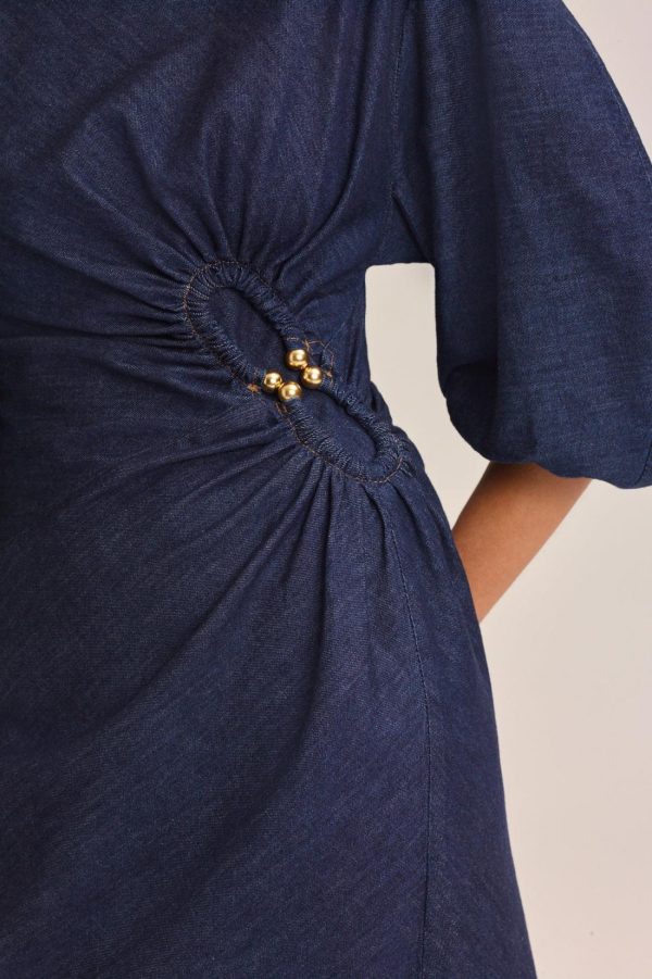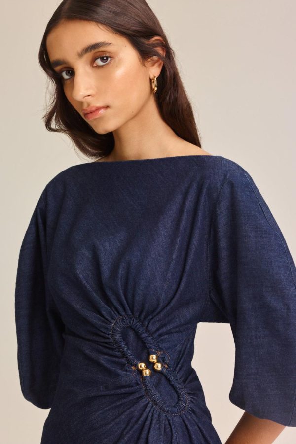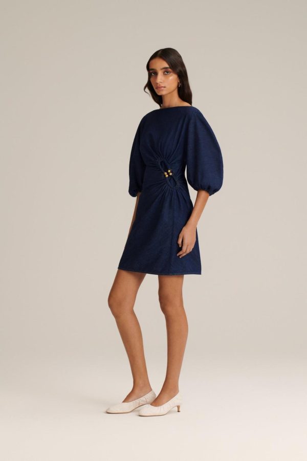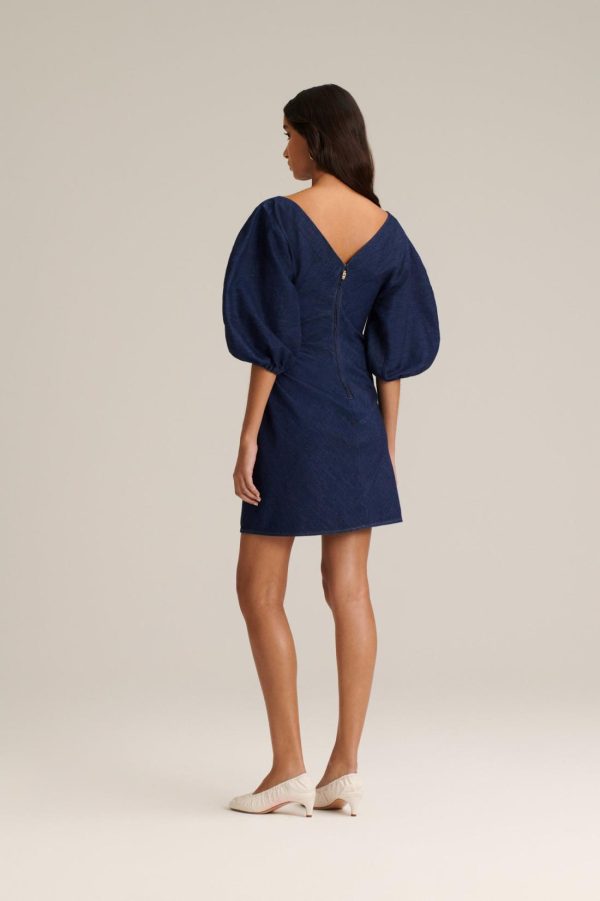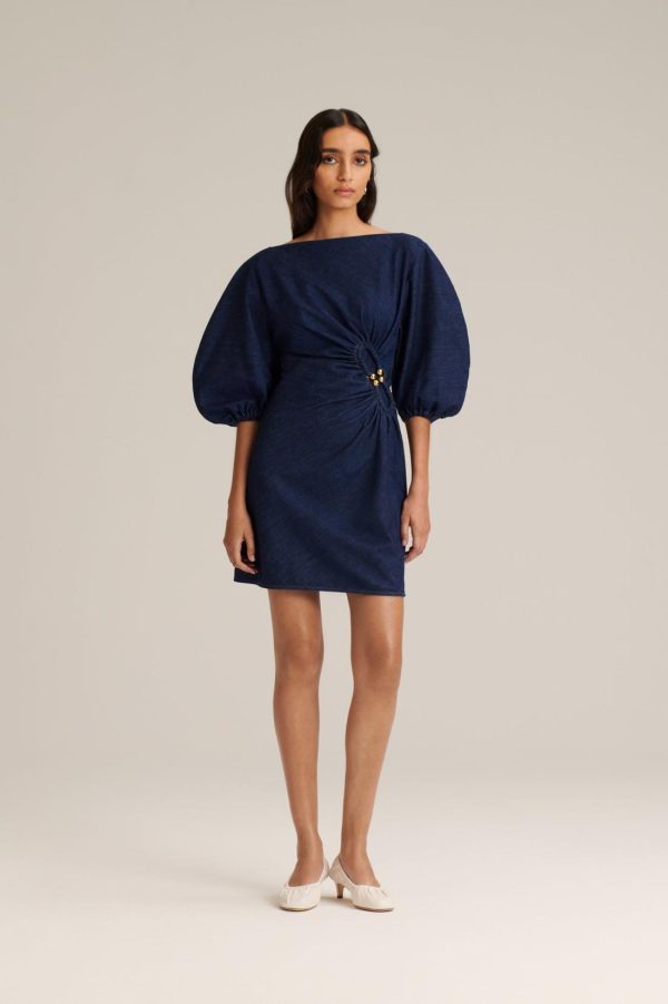 Reimagining signature silhouettes with modern sophistication, this mini dress is impeccably tailored from luxurious Italian denim. The boat neckline elegantly sits across the collarbones, while mid-length balloon sleeves add fluidity and volume to the dress. The asymmetrical gathered detailing at the waist and low-cut back adds a touch of understated allure, while the signature gold horseshoe trim embellishes the design.