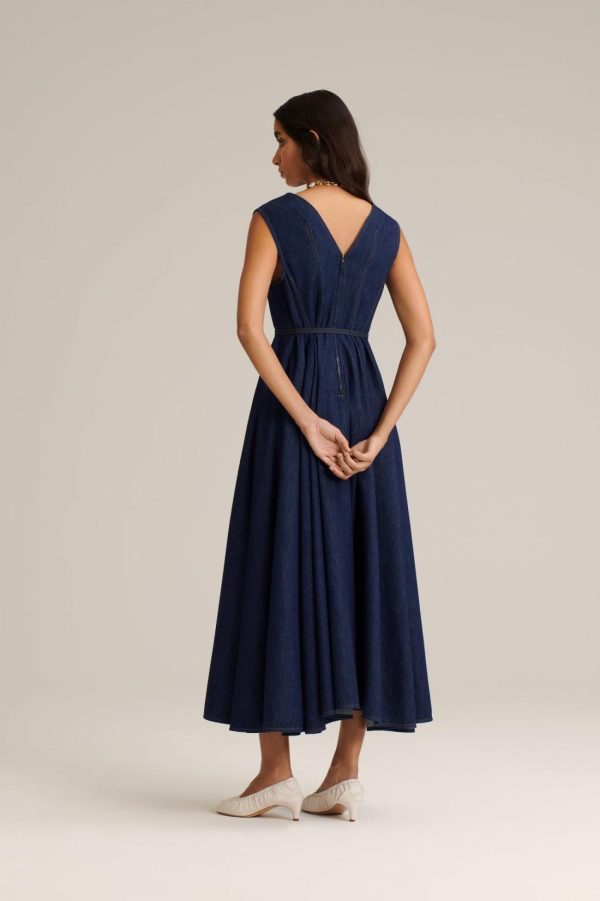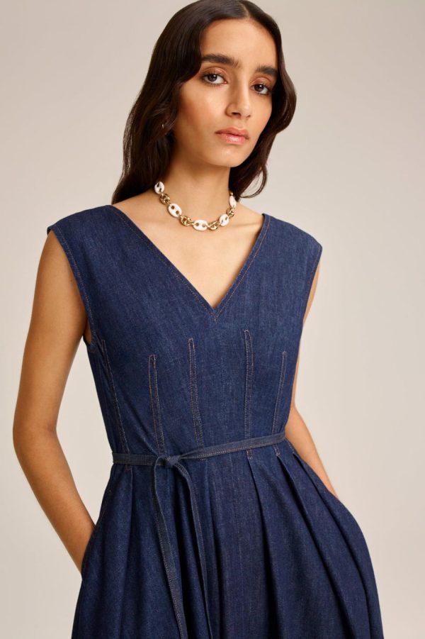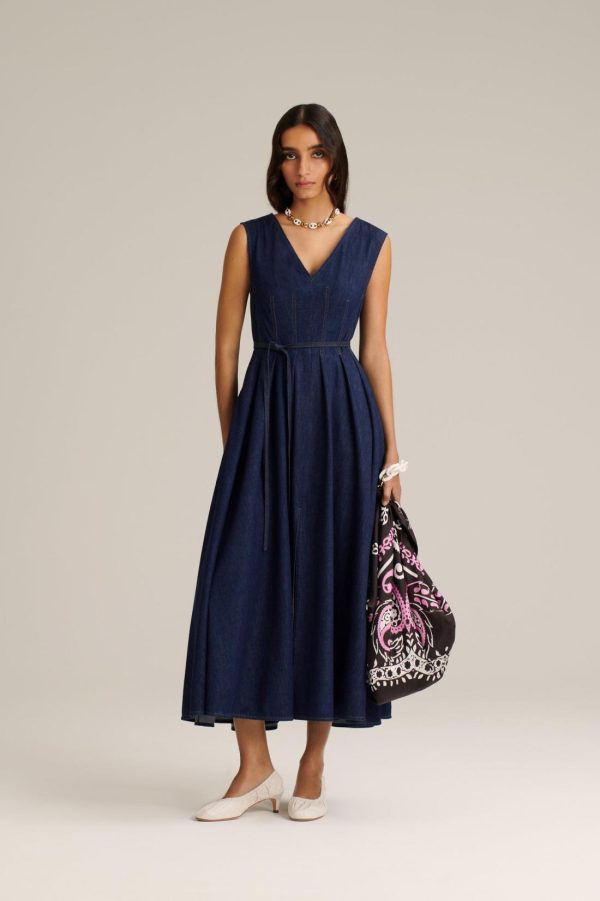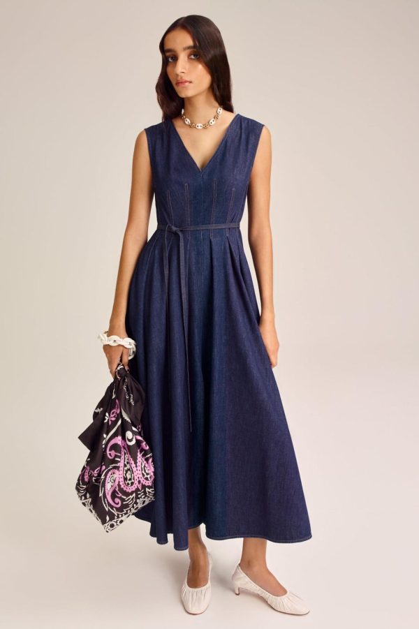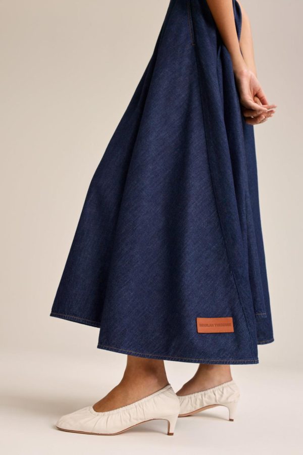 A sophisticated reimagining of classic silhouettes, this denim dress exemplifies Scanlan Theodore’s signature aesthetic, where timeless tailoring meets modern elegance. Expertly crafted from 100% cotton denim, the A-line silhouette is tailored through the waist before falling into a voluminous, pleated skirt. The belted waistline accentuates the silhouette, while discreet side pockets, front hem split and a back zip closure lend thoughtful functionality. The dark indigo wash is elevated by contrast topstitching, offering a refined interplay of structure and artisanal detail.