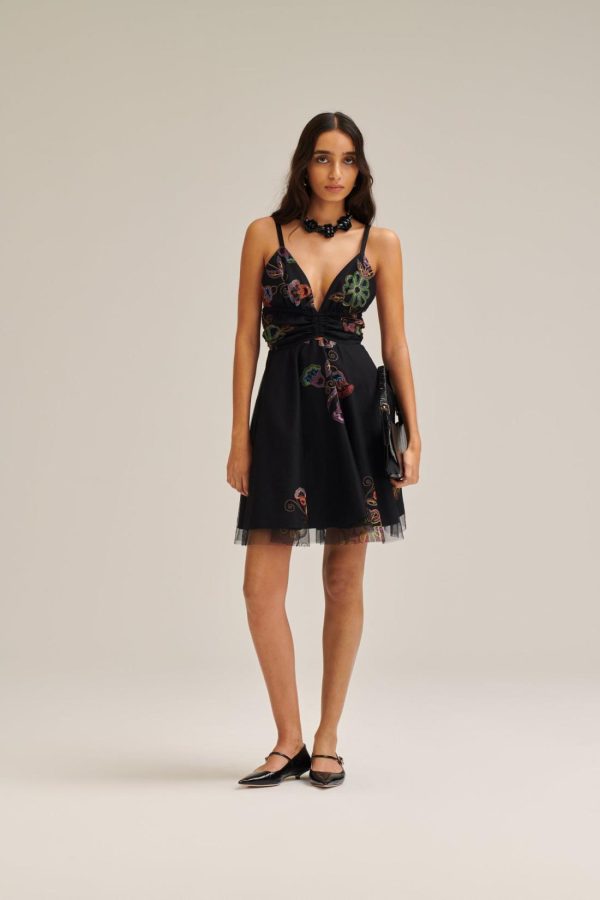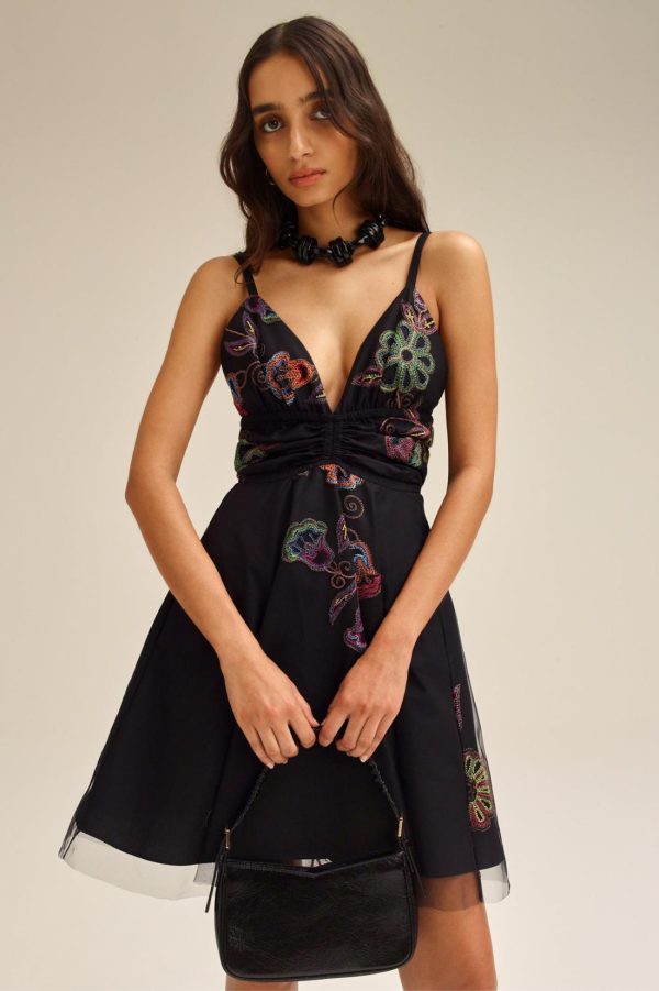 Embodying modern opulence and romantic allure, this mini dress is crafted from delicate black tulle, intricately embroidered with a vibrant floral motif. Sculpted through the waist, the dress is elevated by a V-neckline and voluminous skirt, enhanced by a cascading tulle overlay that adds an ethereal quality.