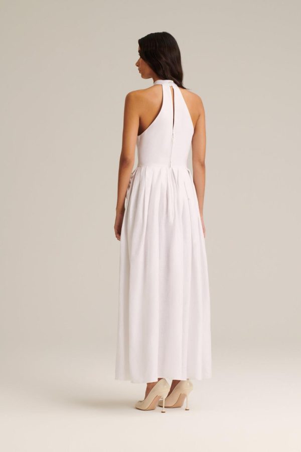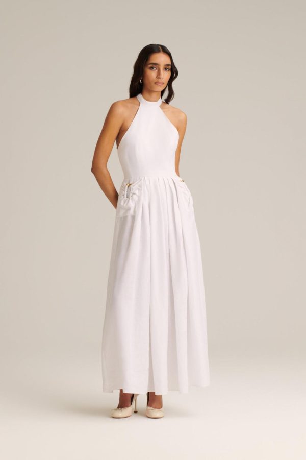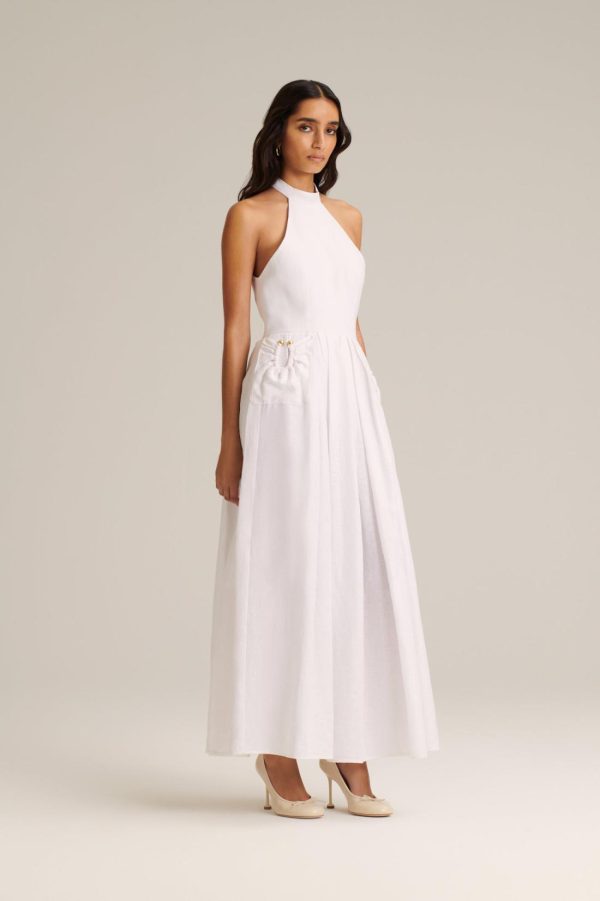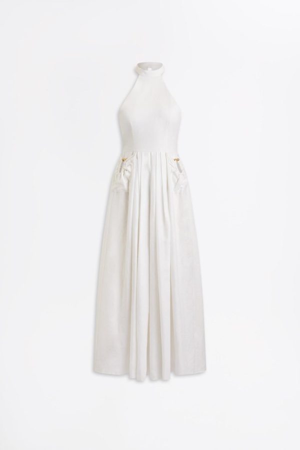 Infused with timeless elegance, this mid-length dress is expertly crafted from 100% linen in a fresh white hue. The voluminous, A-line silhouette is defined by a sculptural halter neckline and pleated skirt. Elevated by signature detailing, the dress is adorned with gold horse hardware that embellishes the pockets. Designed for warm-weather styling, the dress captures effortless sophistication with a modern sensibility.