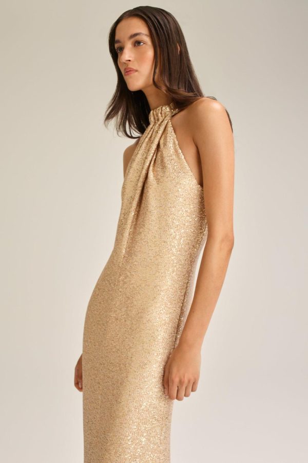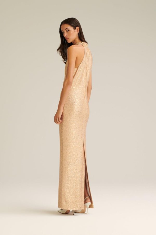Imbued with sophisticated elegance and high-impact glamour, the dress is tailored from an opulent sequin fabrication that showcases a luminous gold colourway. The silhouette features a turban-twist neckline and back keyhole opening.