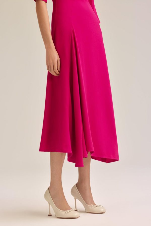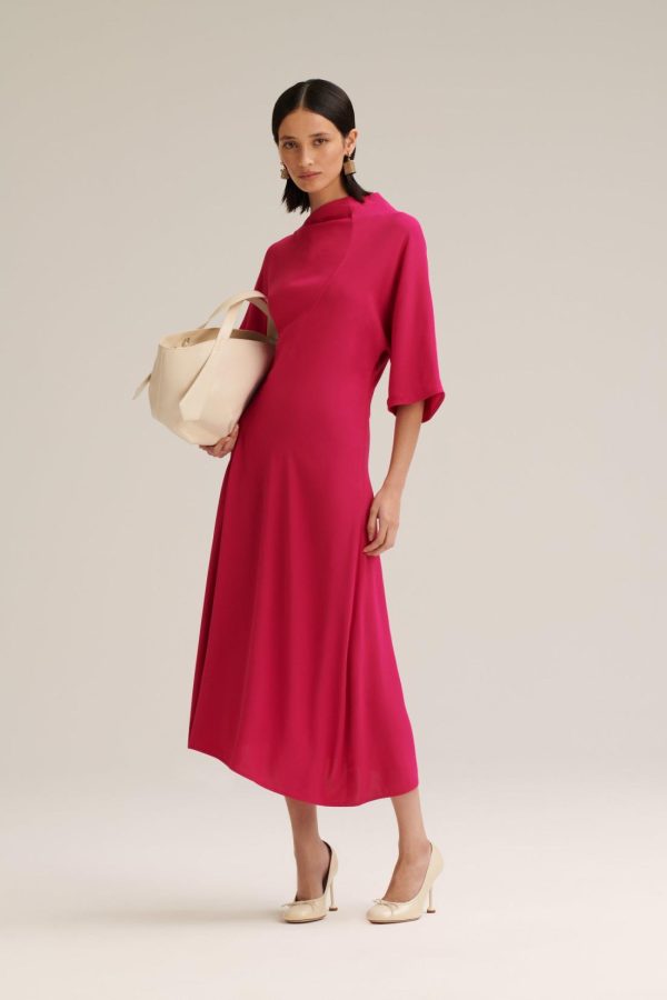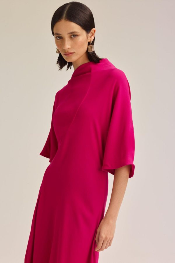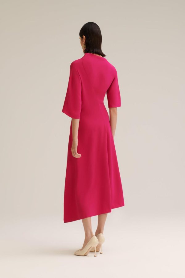 Balancing directional style with refined elegance, this mid-length dress is crafted in a vibrant fuchsia colourway. Defined by the high neckline and asymmetrical hemline, the fabrication is elegant draped across the body for refined fluidity and subtle voluminous.