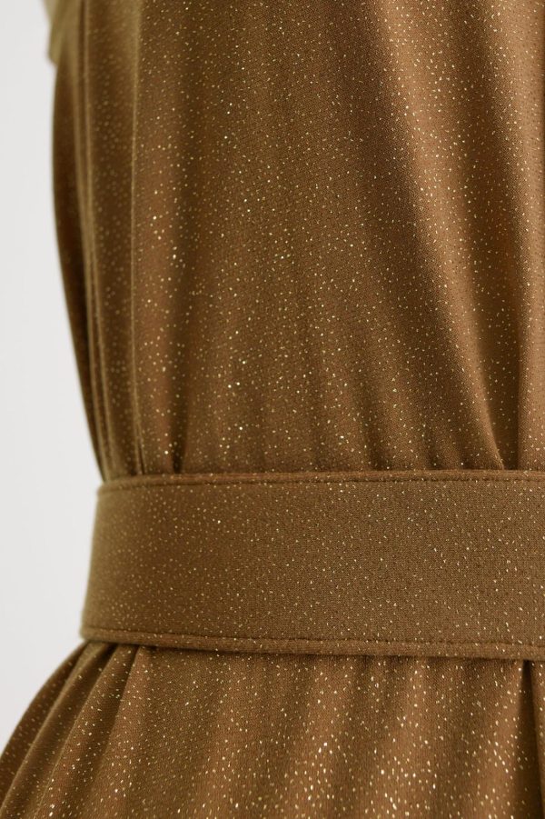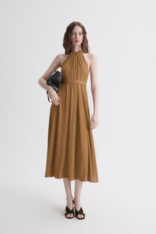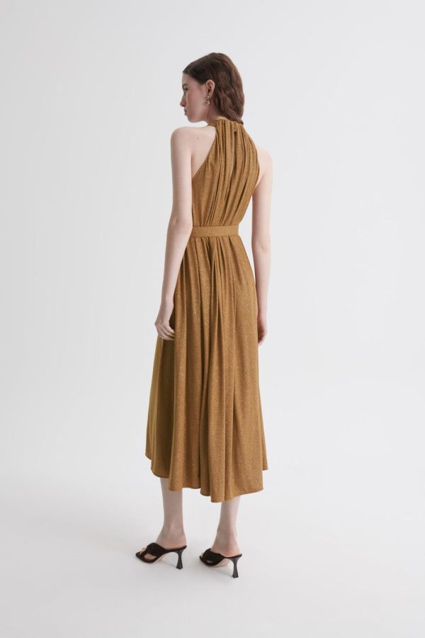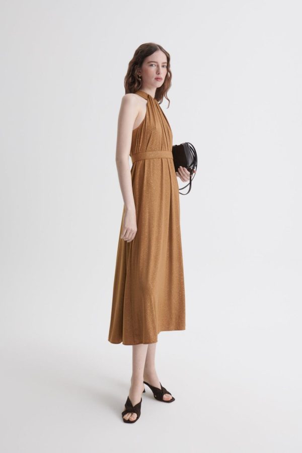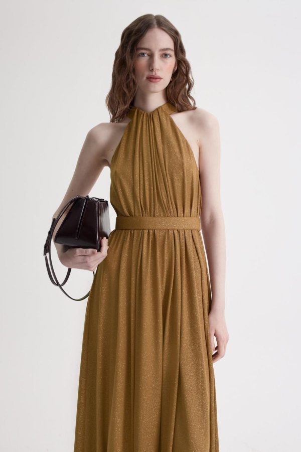 Opulent details with contemporary charm embellish this draped gown. The fluid silhouette is defined by a halter neckline and soft pleating, cinched elegantly at the waist with a coordinating belt. Iridescent tinsel print and luminous fabrication infuse the dress, with alluring detail.