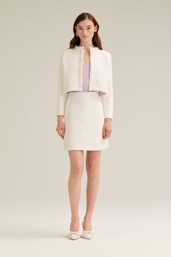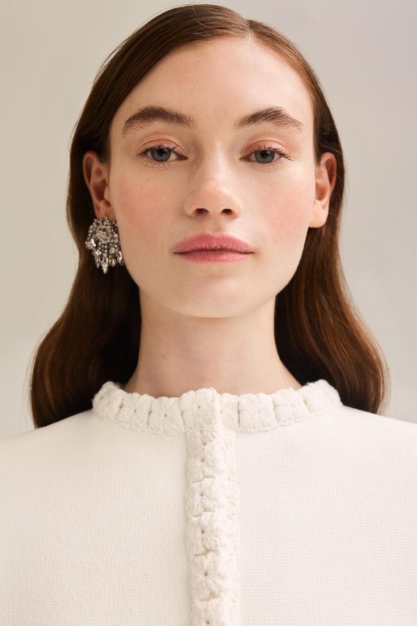 Redefining signature design through modern techniques and considered tones, this jacket is crafted from Crepe Knit. The structured silhouette is embellished by hand-crocheted daisy trimming for a touch of feminine elegance.