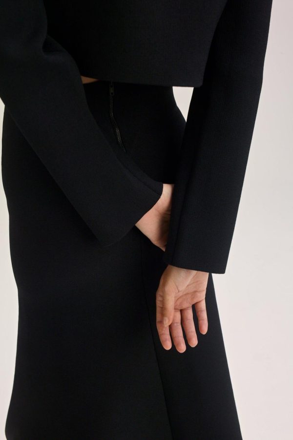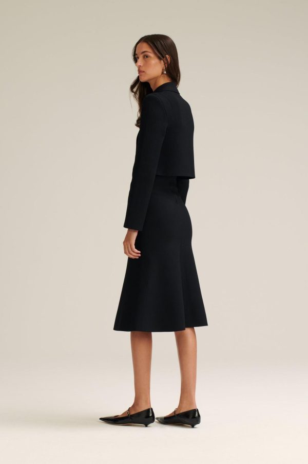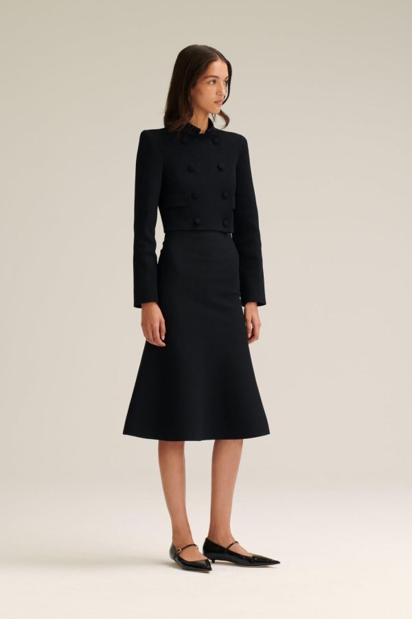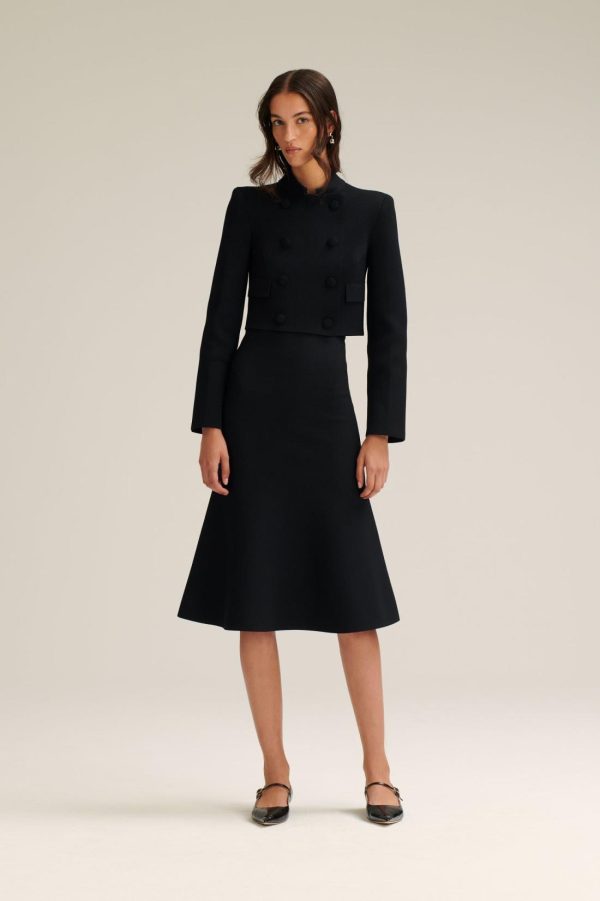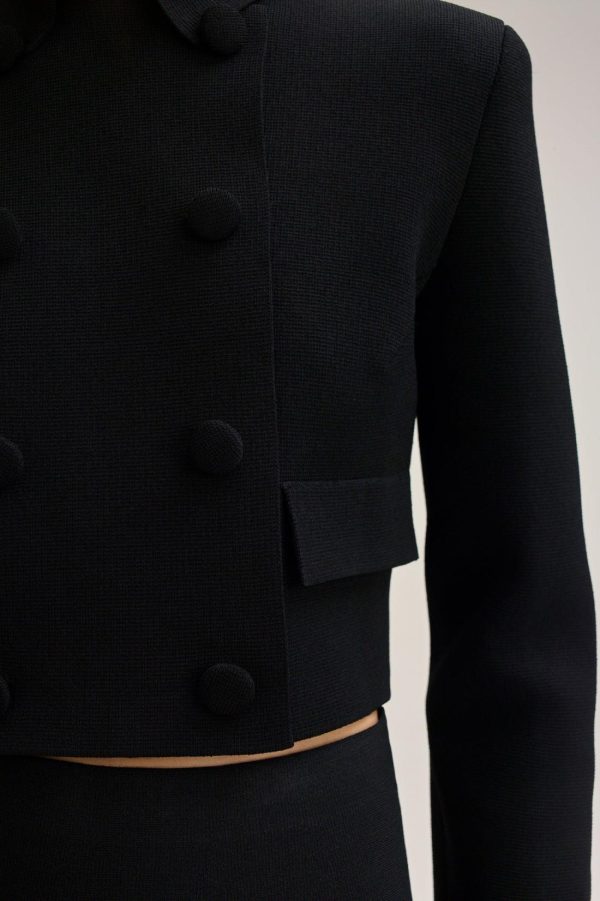 The timeless aesthetic of this double-breasted jacket is characterised by signature Scanlan Theodore crepe knit fabrication. The cropped silhouette is complemented by a high neckline, front button detailing and flap pockets.