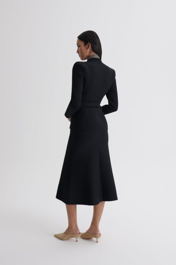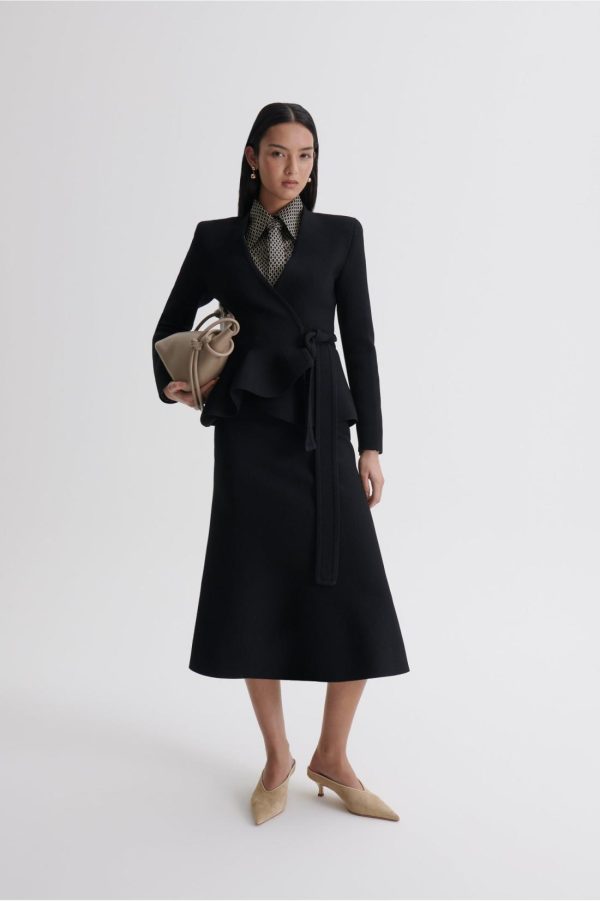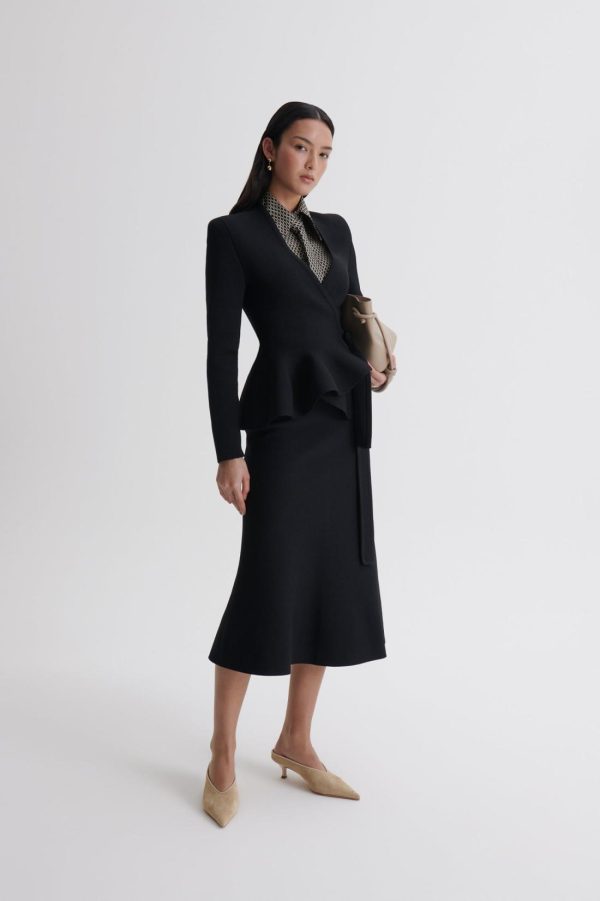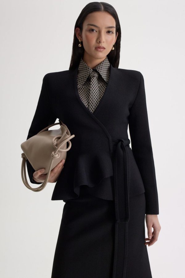Redefining signature design through modern techniques and classic hues, this jacket is crafted from Crepe Knit. Tailored to accentuate the waist, the wrap silhouette is defined by the voluminous peplum hemline and tie belt.