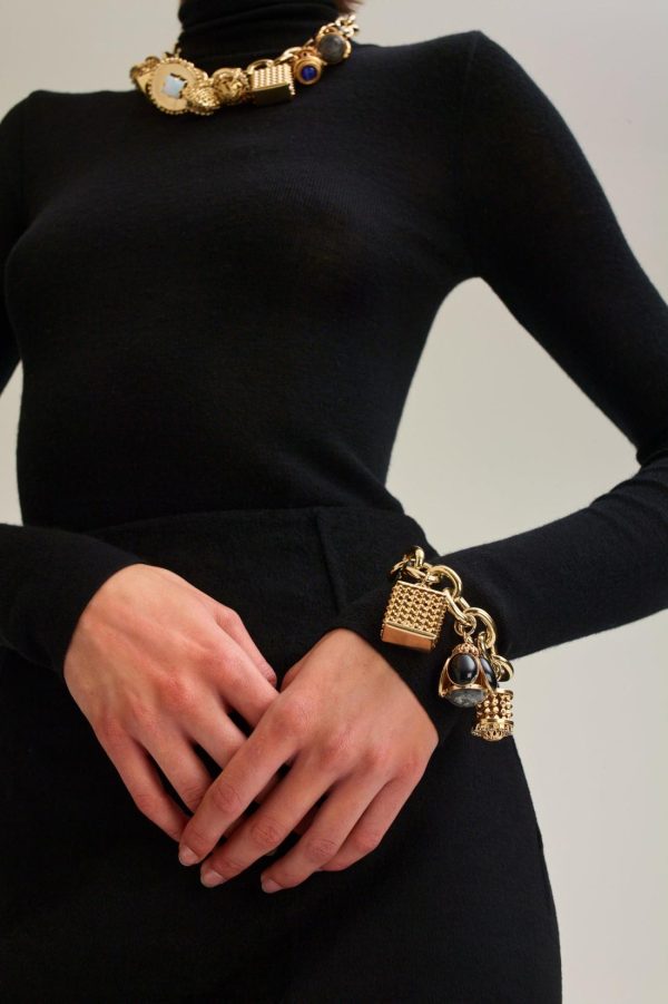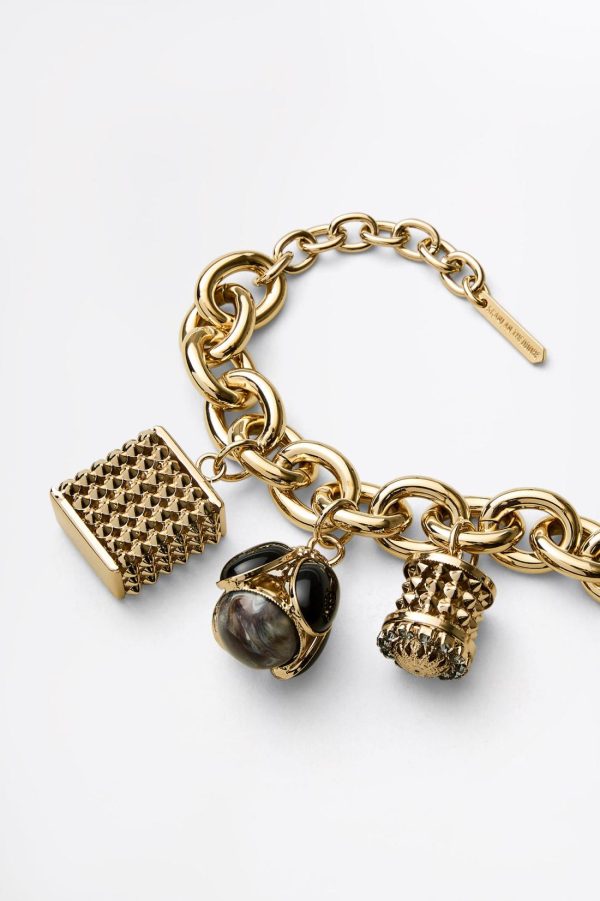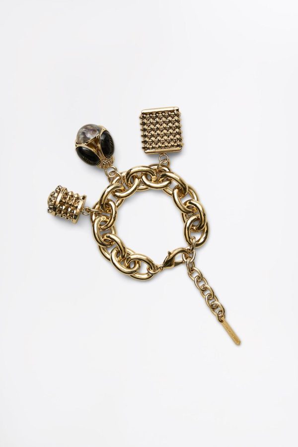 Crafted by skilled artisans in Italy, the bracelet features gold-plated chain links that are adorned with antique-inspired charms detailed with diamantes and resin stones.