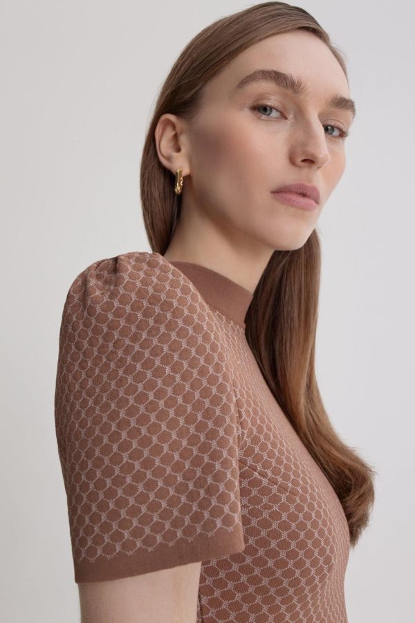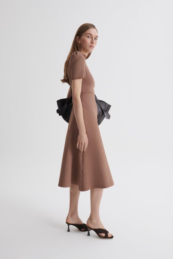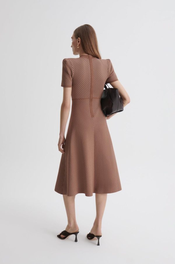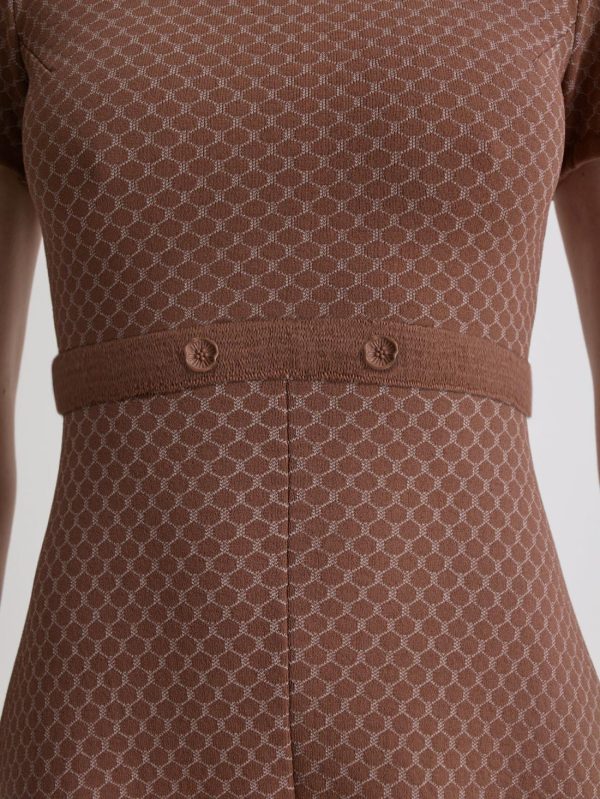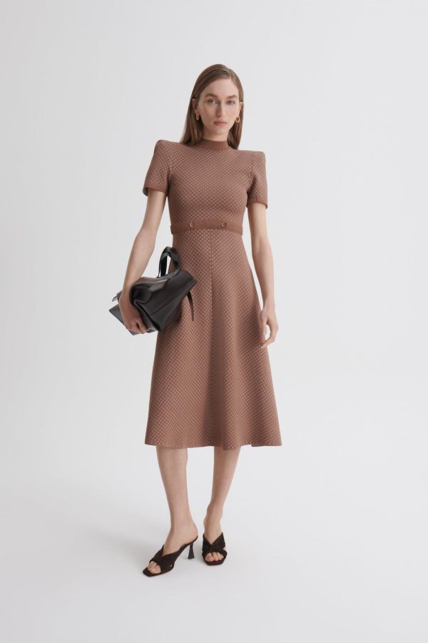 A study of signature elegance and refined sophistication, this Crepe Knit dress is detailed with an intricate rope jacquard. The A-line silhouette features a high, contrast neckline and tailored waist, while the tailored shoulders and short sleeves are detailed with gathered accents.