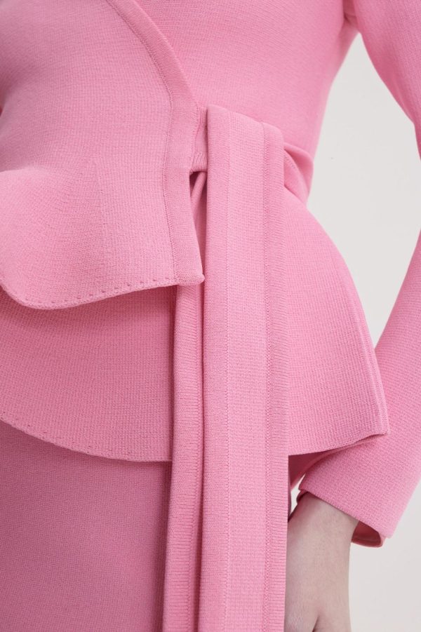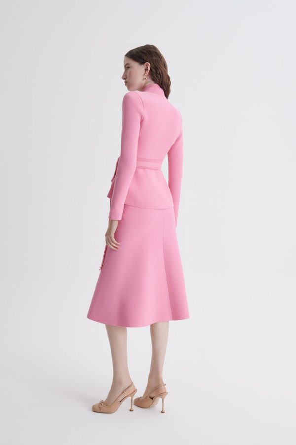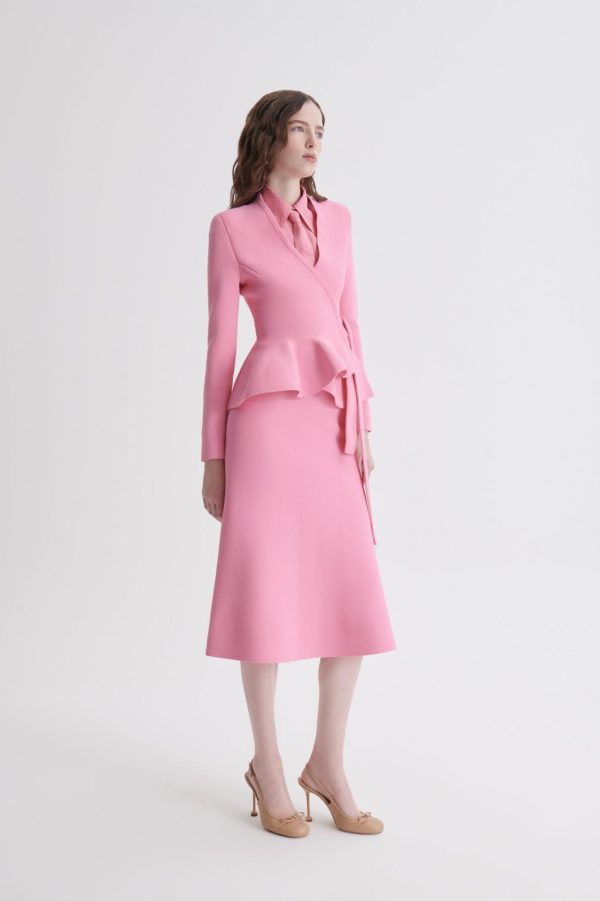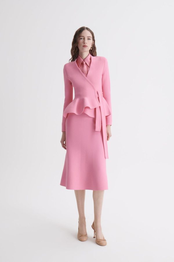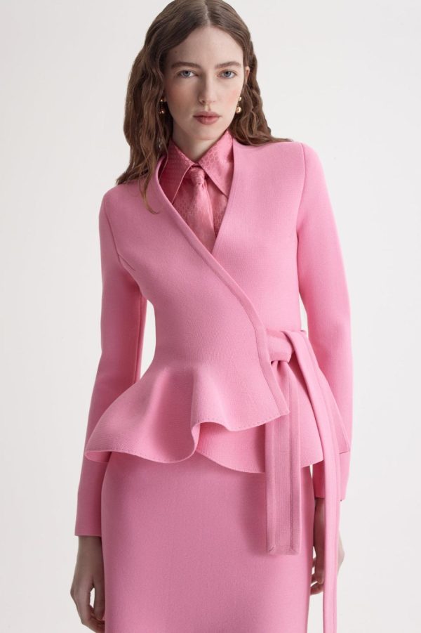 Redefining signature design through modern techniques and vibrant tones, this jacket is crafted from Crepe Knit. Tailored to accentuate the waist, the wrap silhouette is defined by the voluminous peplum hemline and tie belt.