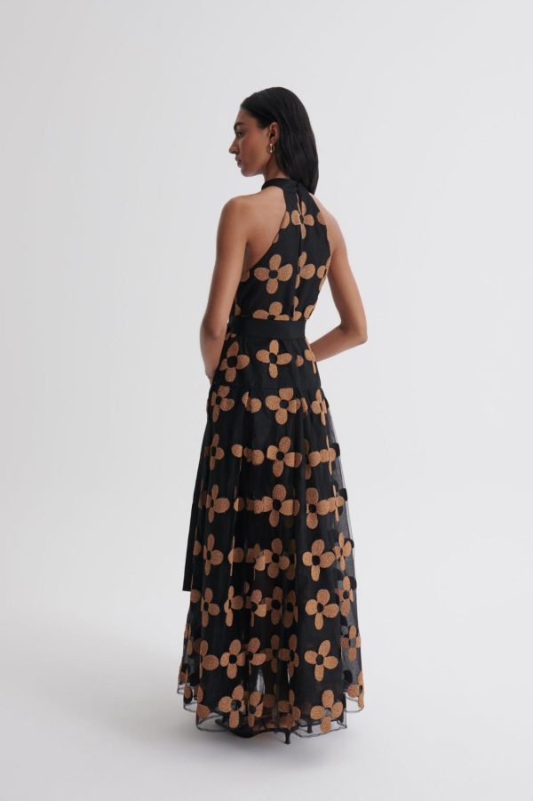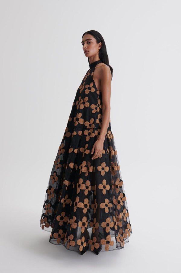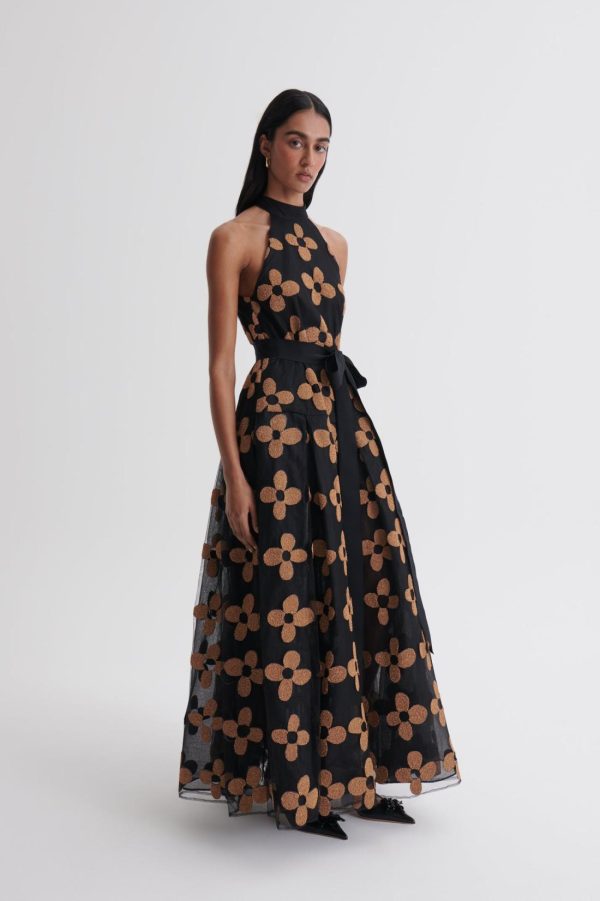 A balance of refined elegance and alluring detailing characterises this dress. The A-line silhouette is defined by the halter neckline and grosgrain tie belt which creates subtle pleating through the voluminous skirt, while the floral motif adds feminine embellishment to the French tulle garment.