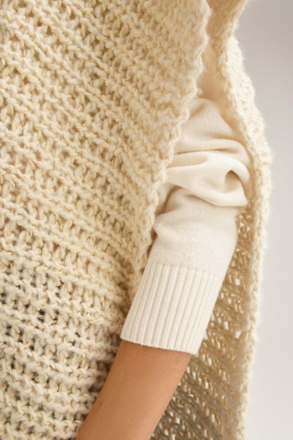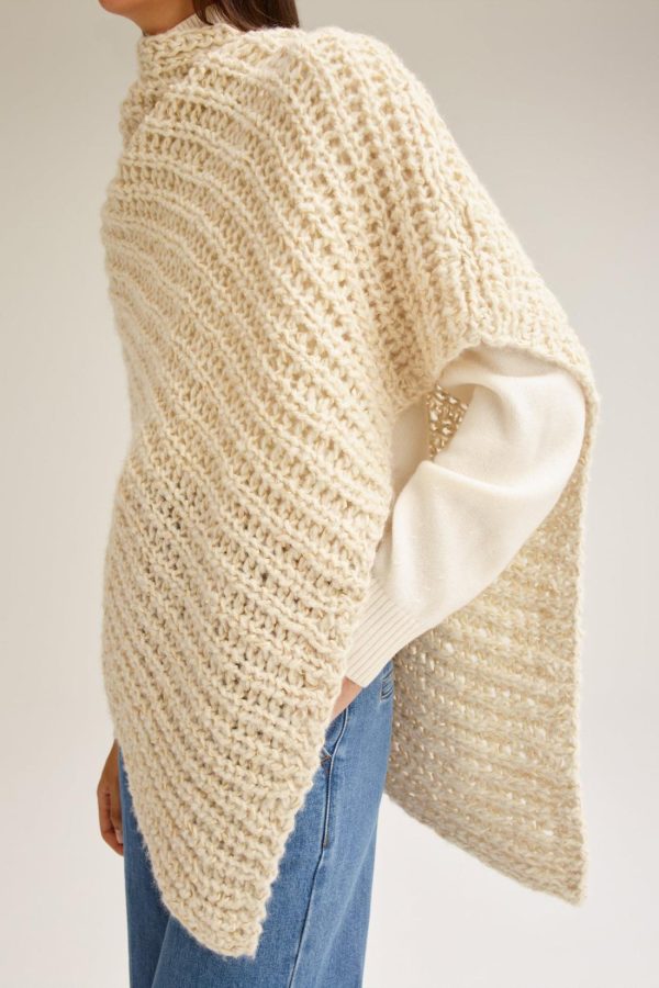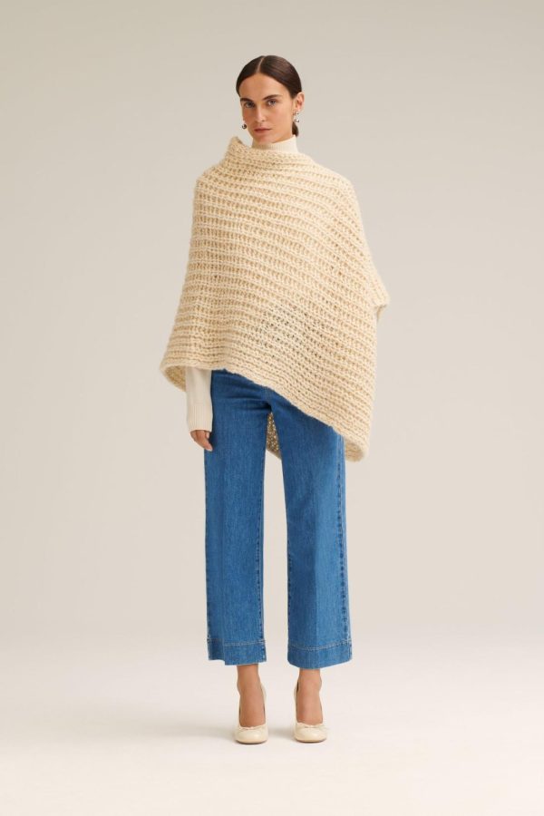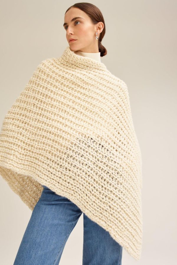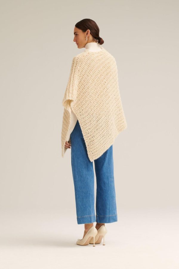Reimagining luxurious layers, crafted from a fine merino wool and alpaca blend, this cape has been hand knitted with raffia nylon for a crispy touch. The draped silhouette gracefully cascades over the shoulders to an asymmetric hemline epitomising refined elegance and unparalleled craftsmanship.