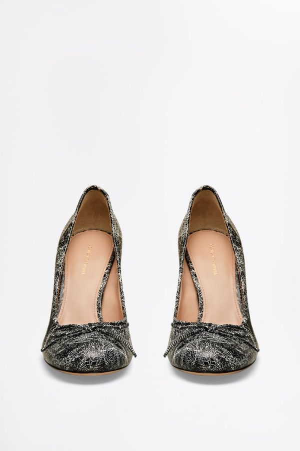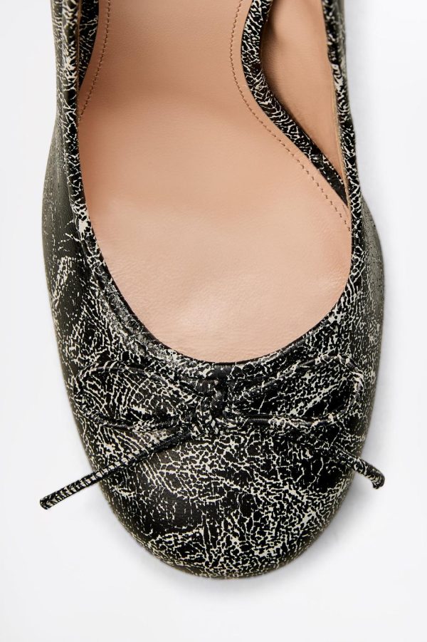 Subverting timeless design with a contemporary attitude, these pumps are crafted from Italian printed craquelé leather that is emphasised by the contrasting black and white tones. Inspired by the classical elegance of ballerinas, the round-toe silhouette is adorned with a tonal bow, while the high stiletto heel flares at the curved base.