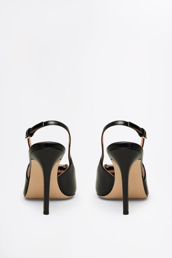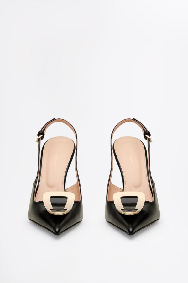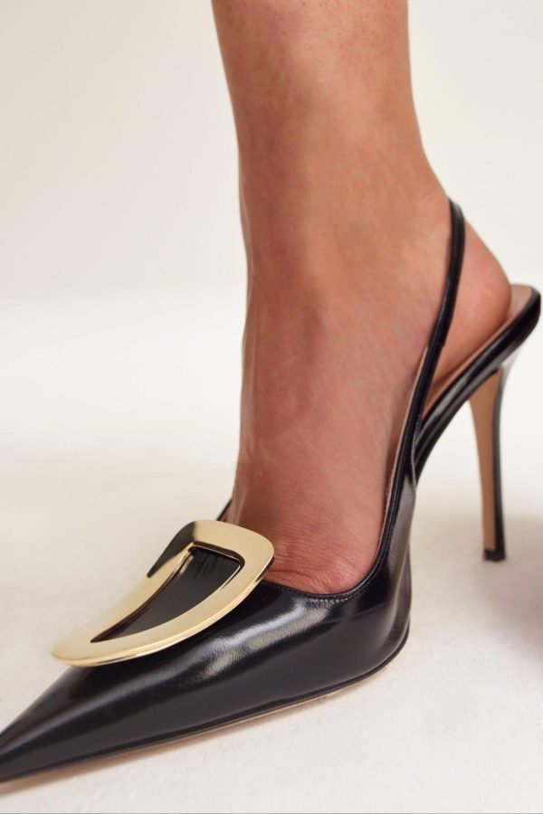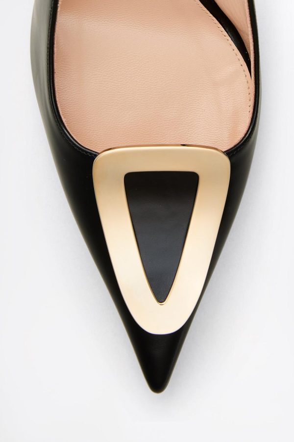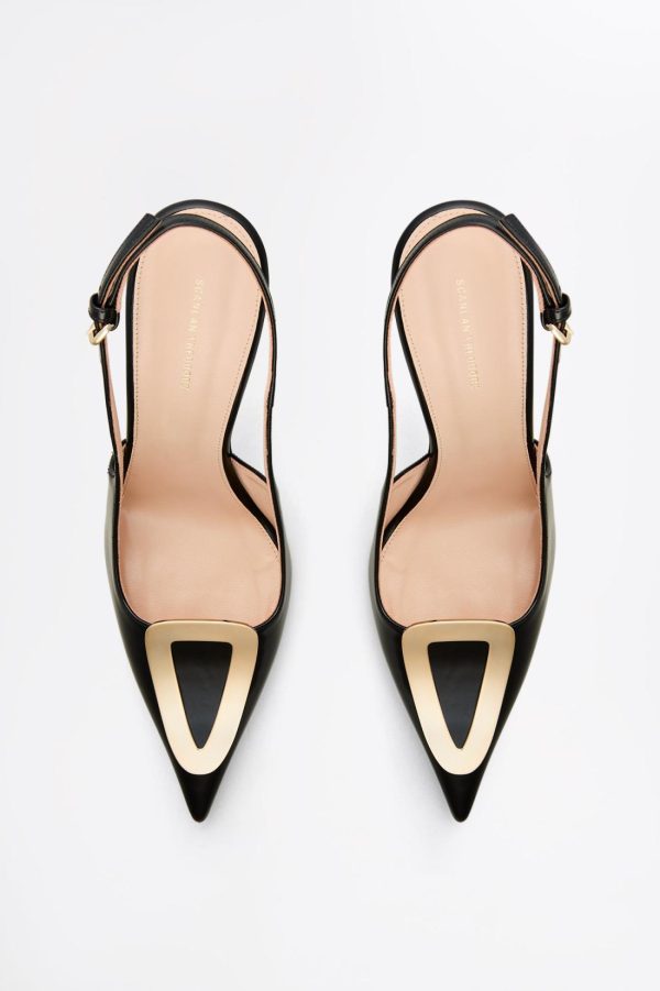 Timeless elegance and emblematic detailing define the silhouette of these pumps. A contemporary, curved iteration of the Scanlan Theodore triangle motif and gold buckle detailing embellish the slingback design.