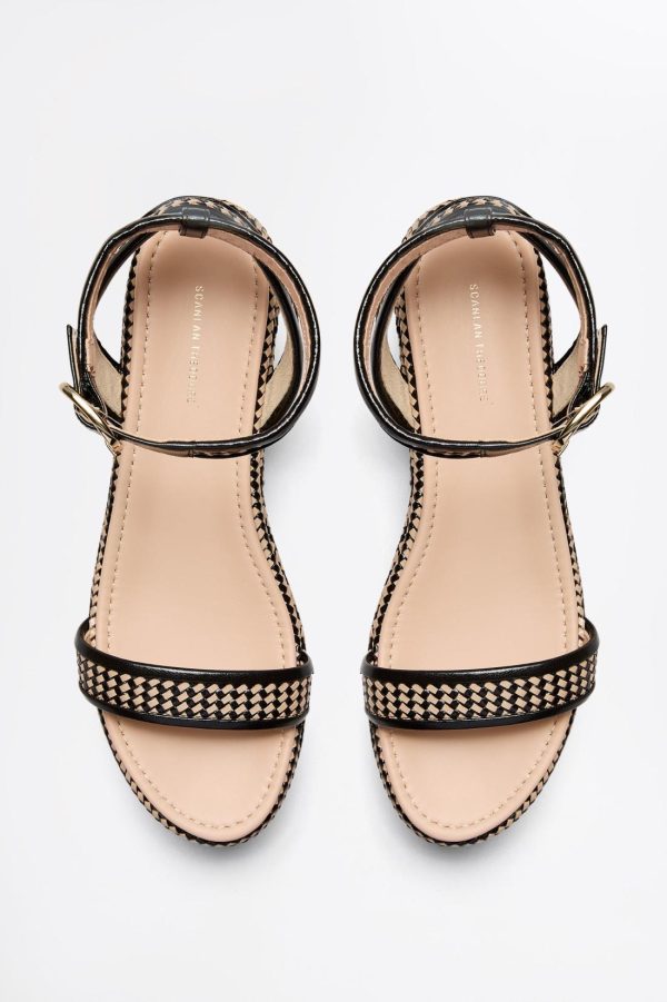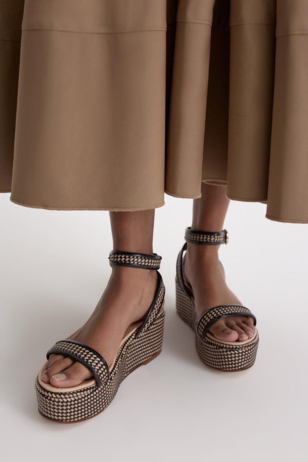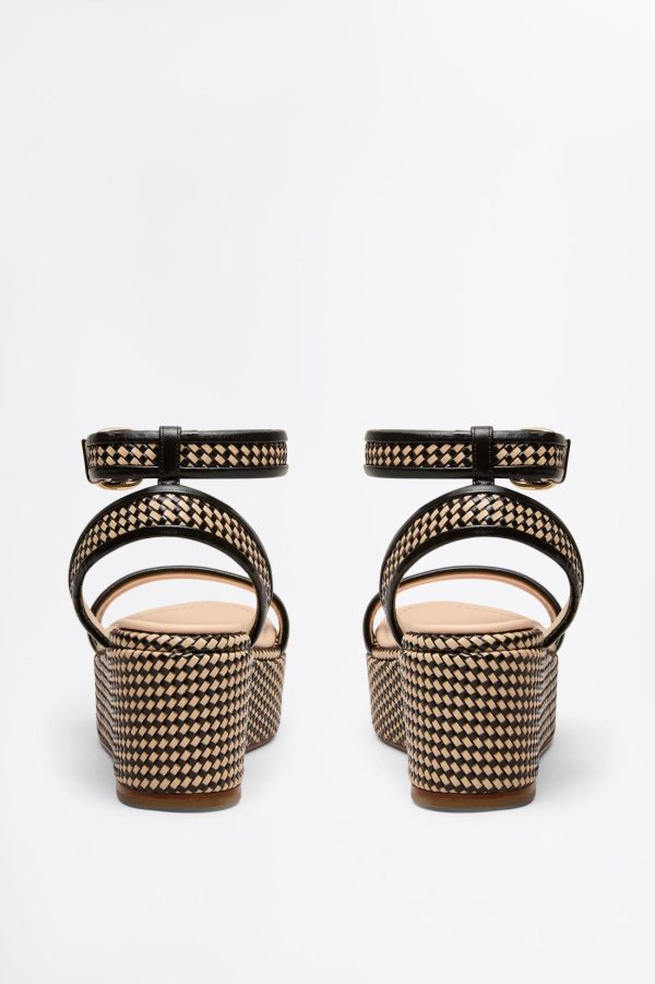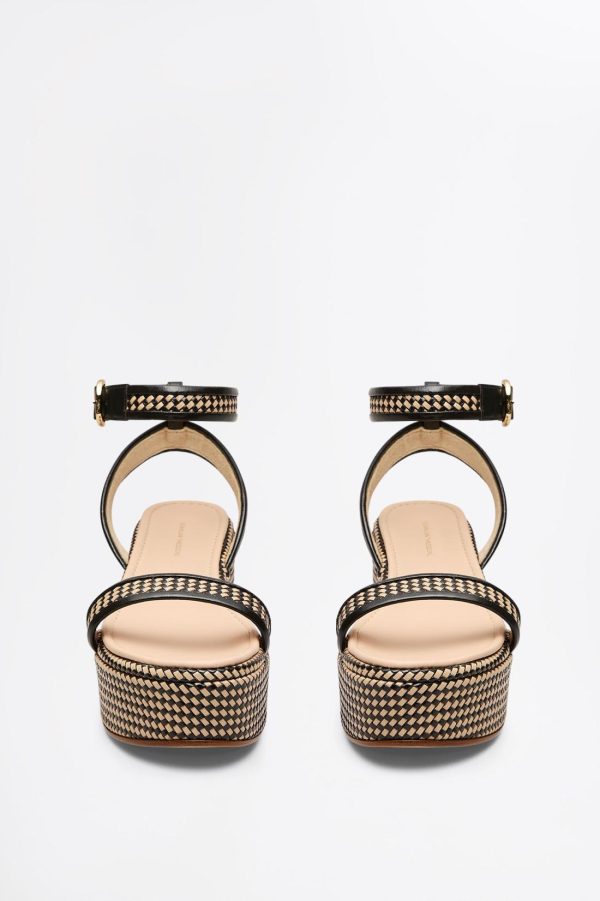 Summer textures meet artisanal craftsmanship in these woven and leather platform sandals. Expertly crafted in Italy, the round-toe silhouette is elevated by bold, sculptural soles that lend a refined yet versatile character. Contrasting black and brown woven detailing and gold buckle closure adds a striking touch of texture and sophistication.