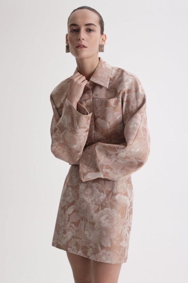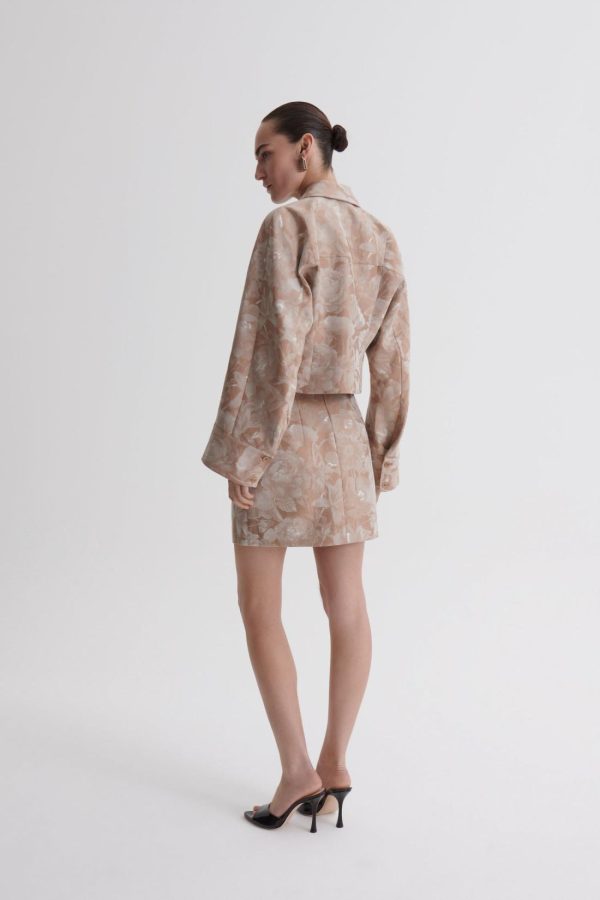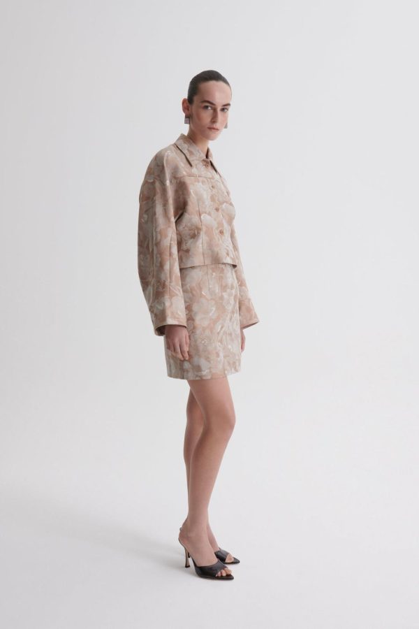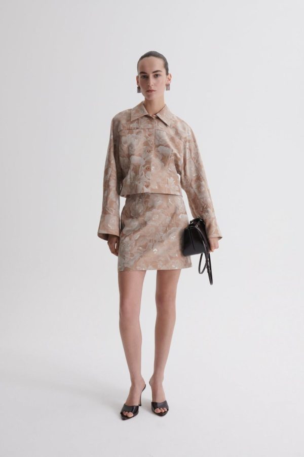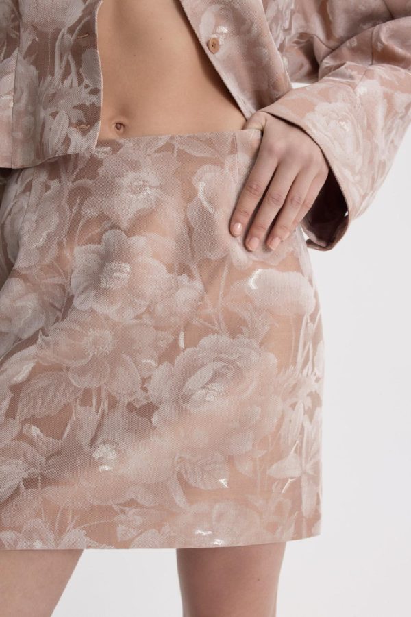Evoking refined elegance and contemporary romance, this mini skirt is crafted from a French linen-blend fabrication. The sleek, minimalist silhouette is adorned with a soft floral print.