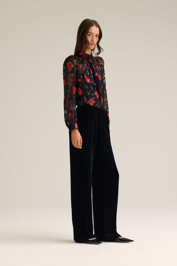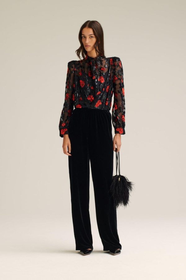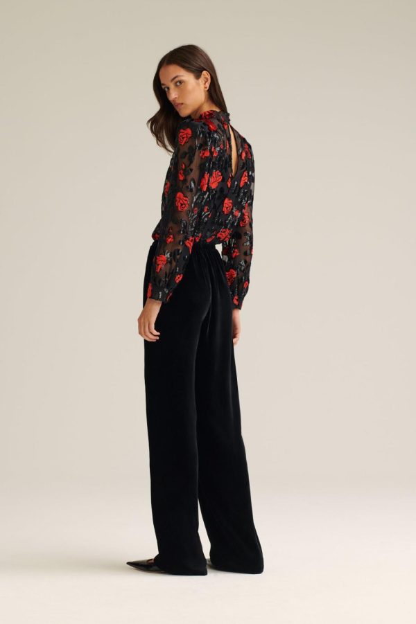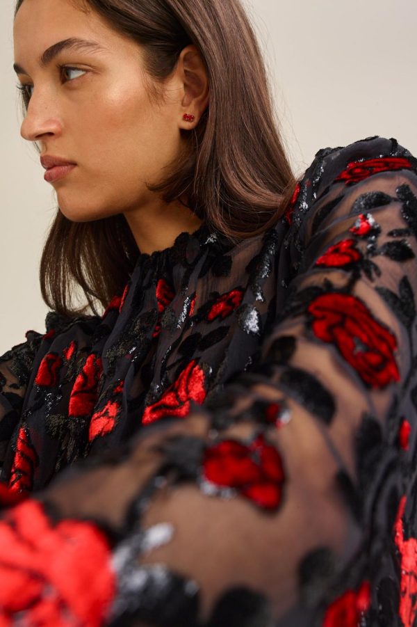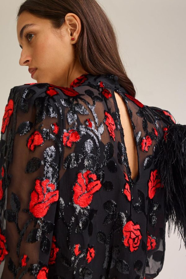 Delicate, shimmering florals adorn this sheer blouse, expertly crafted from a luxurious silk blend. The high neckline and structured shoulder pads define the elegant silhouette, while the blouson sleeves and back keyhole opening further elevate the refined design.