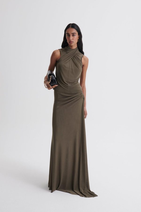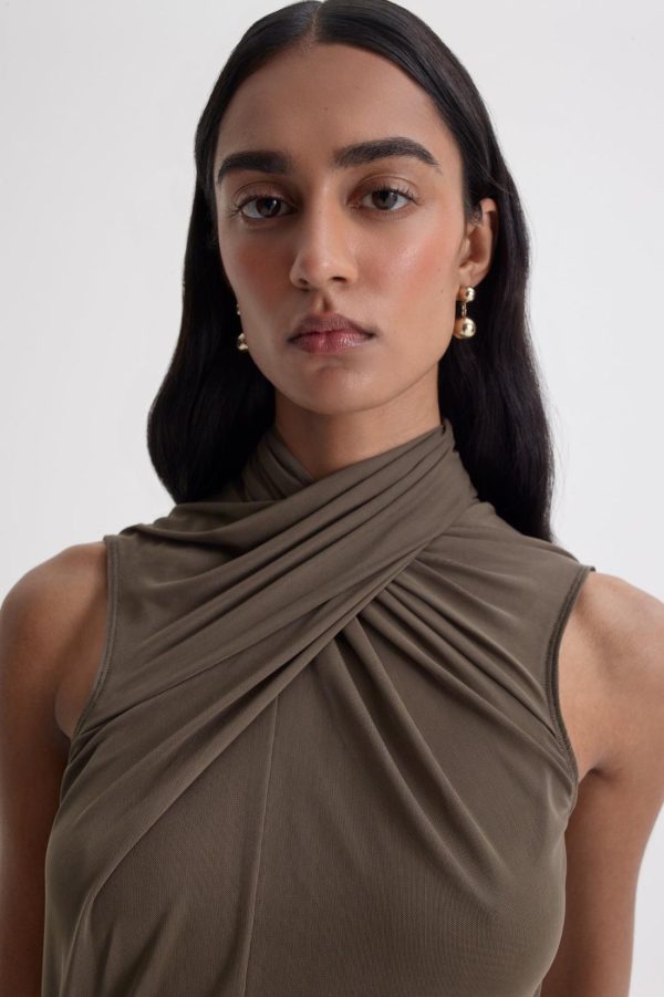 Designed with a modern sensibility, this top is crafted from draped mesh in a rich green tone. The sleeveless silhouette is defined by a twisted neckline and draped detailing, imbuing the piece with a sophisticated and contemporary allure.