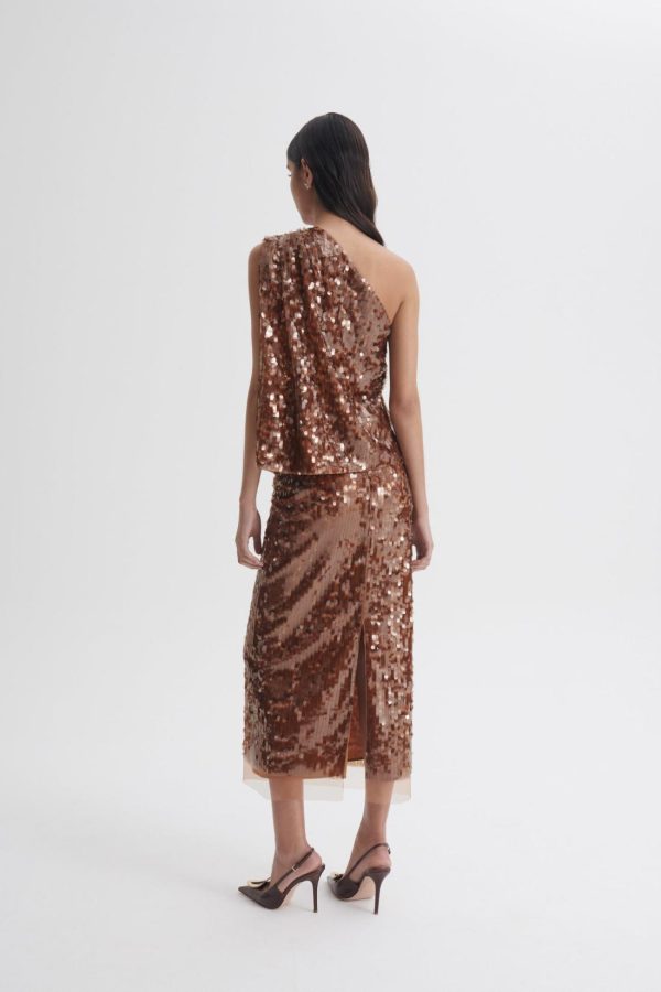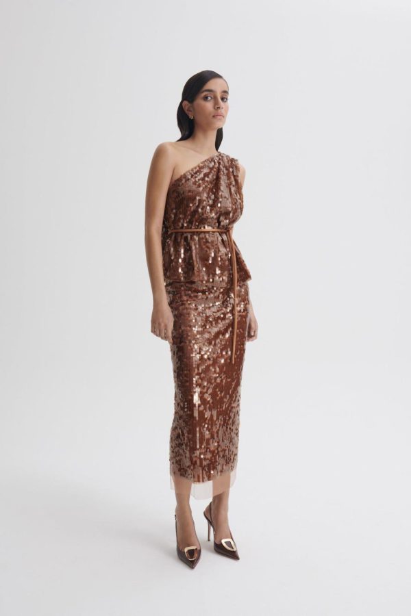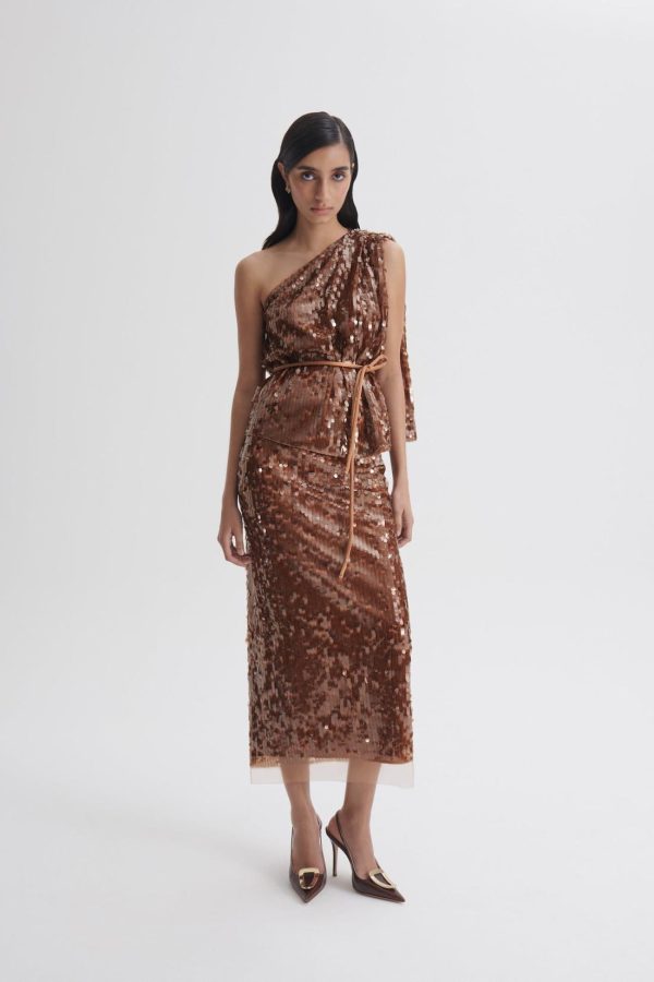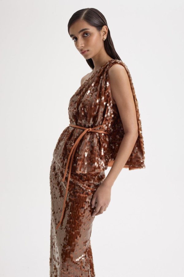 Opulent details with contemporary charm embellished the top. Crafted from luminous round sequins, the one-shoulder silhouette is complemented by draped detailing and delicate silk tie belt that fasten around the waist for alluring detailing.