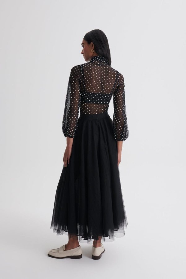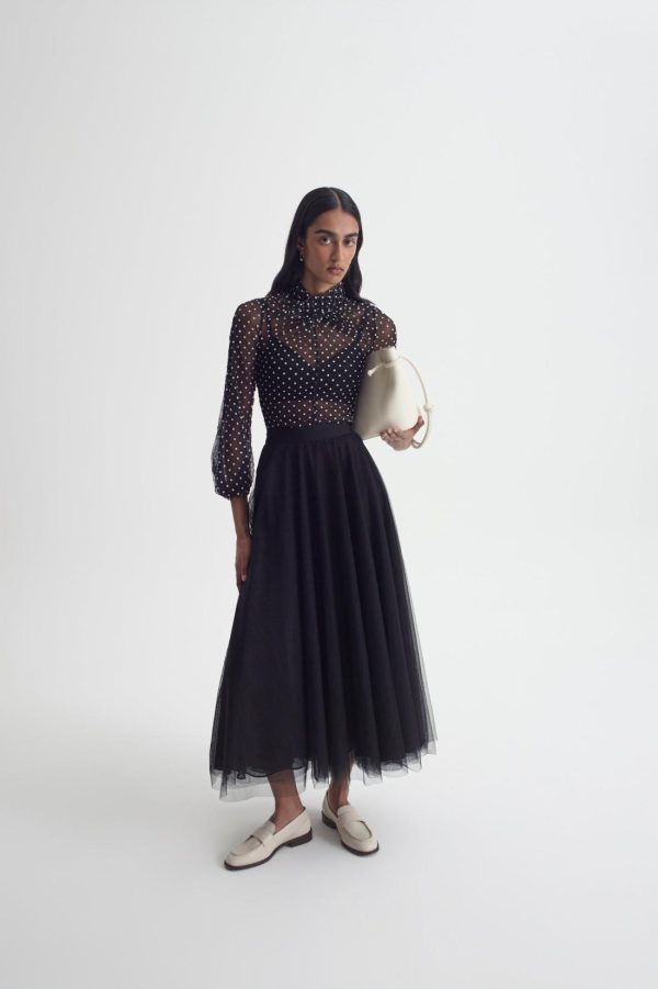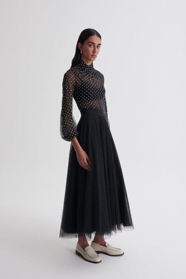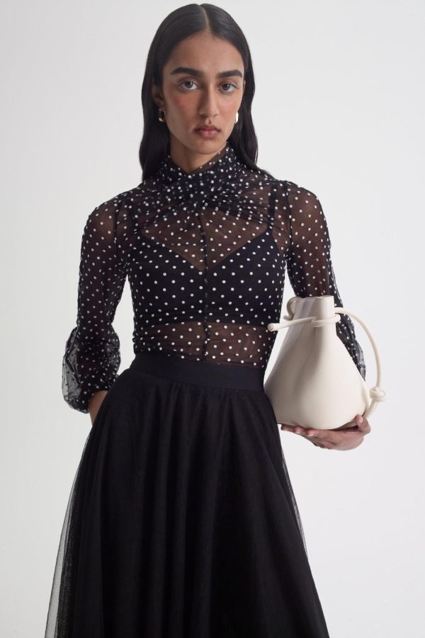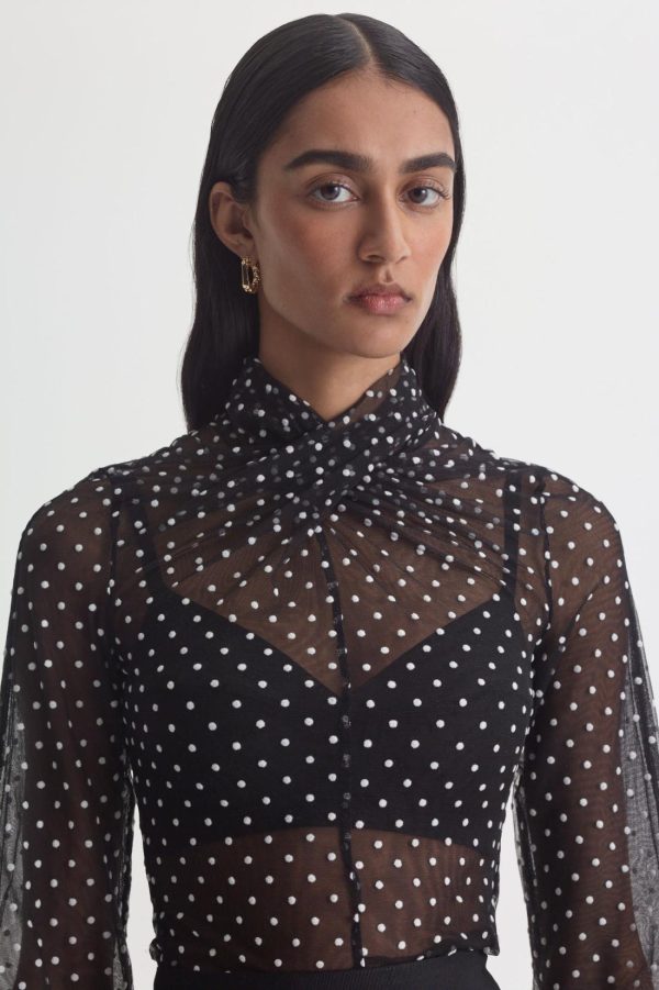 Exuding ornate romanticism and perennial femininity, this blouse is crafted from black tulle adorned with intricate velvet spot detailing. The high, twisted neckline and voluminous blouson sleeves elevate the sheer, ethereal silhouette.